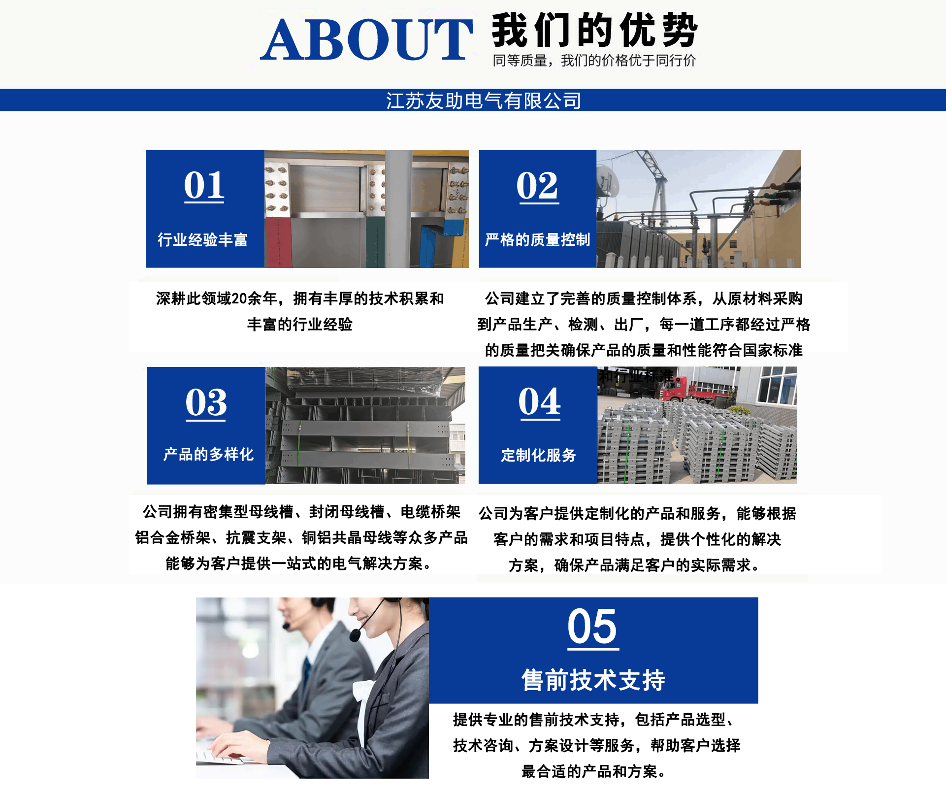 江蘇友助電氣有限公司地處中國工程電氣生產基地-一江蘇省揚中市。經營范圍:電纜橋架,母線槽(橋),管型母線,銅軟連接(伸縮節),高低壓開關柜,配電箱,抗震支架產品系列?!」咀谥迹嚎蛻糁辽稀R殉晒榻K二十屆省運會會場-泰州體育館,南京寶龍商業綜合體,張家口百兆瓦風電場,濟源市婦幼醫院,威海市未來科技園,湖北皇恩燁新材料科技有限公司,南京中央路小學,南通中天大酒店,新疆新安特鋼有限公司,河北省送變電有限公司,南京南微醫學研發基地等多項工程配套服務,我們愿與您精誠合作,互利共贏!公司技術人員深耕橋架,母線領域30年,為您提供橋架,母線槽疑難問題解決方案。母線槽不論每相是單排,雙排,三根排重疊,不管有多少個水平彎、垂直彎,轉接排在發貨前預裝一遍,確保尺寸無誤。到現場直接擰螺絲,效率高,橫平豎直,規規矩矩,符合標準,供電局,業主,監理,驗收易通過。供貨周期3-7天。為了讓尊貴客戶您,設備安全通電,高枕無憂。我們提供如下售前售中售后服務: 售前:免費技術支持,咨詢?!∈壑?免費現場精確測繪、設計。 售后:安裝服務,免費指導?!≠|量是生命,客戶是源泉。承諾客戶的,一定全力做到。讓我們一起進步!...
